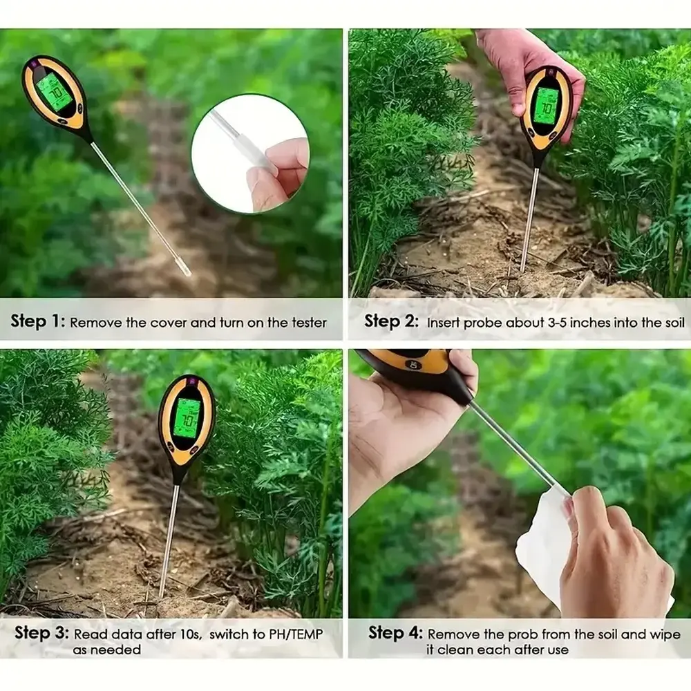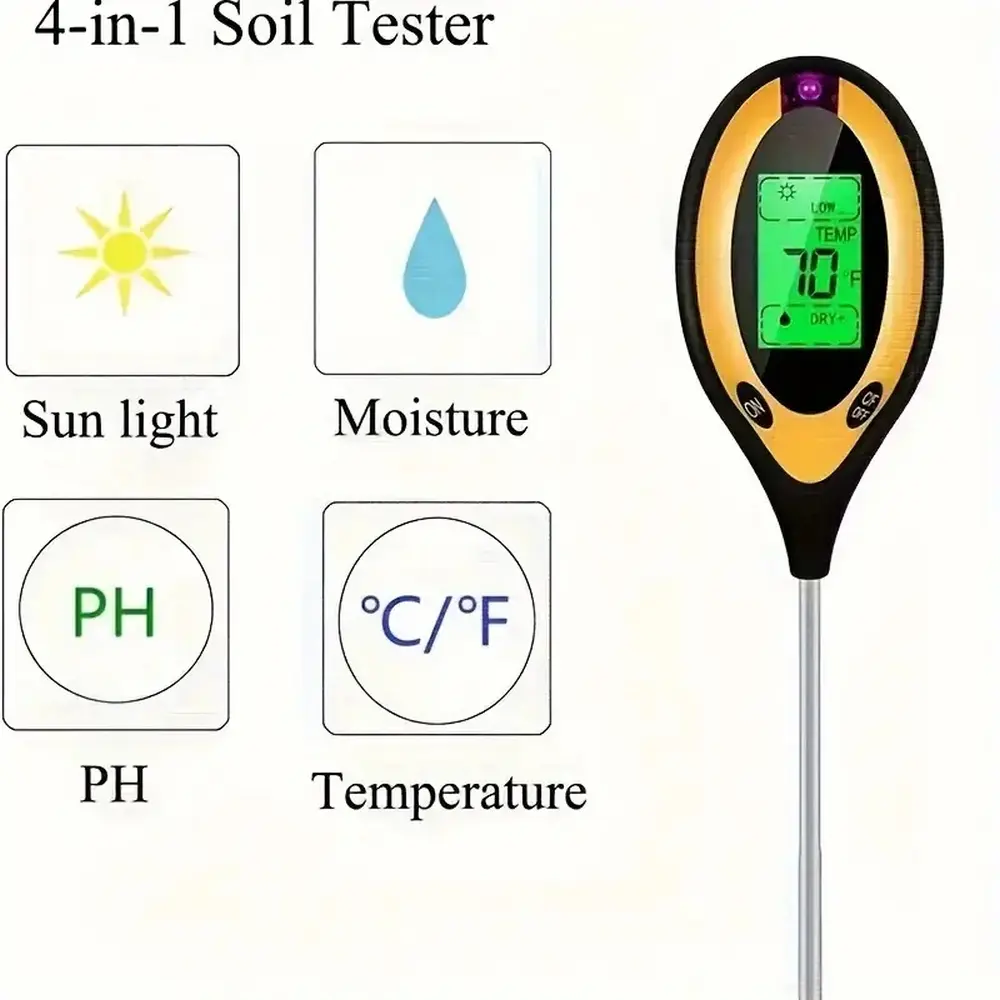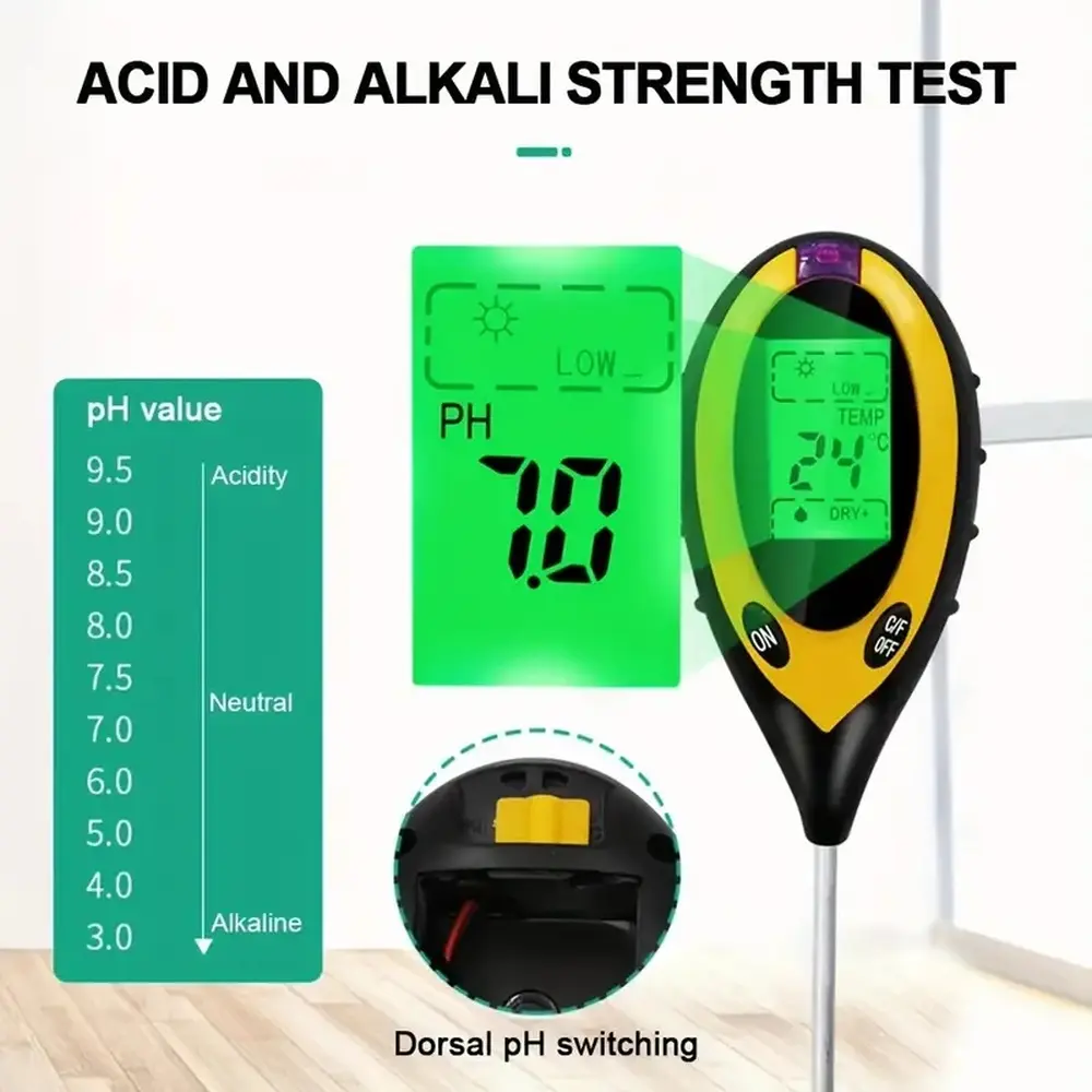 Digitalni PH tester zemlje. Naprava 4 v enem. Omogoča merjene pH zemlje, merjenje temperature, vlage in celo svetlobe. Uporablja 9V ploščate baterije. Naprava ne vsebuje baterije.